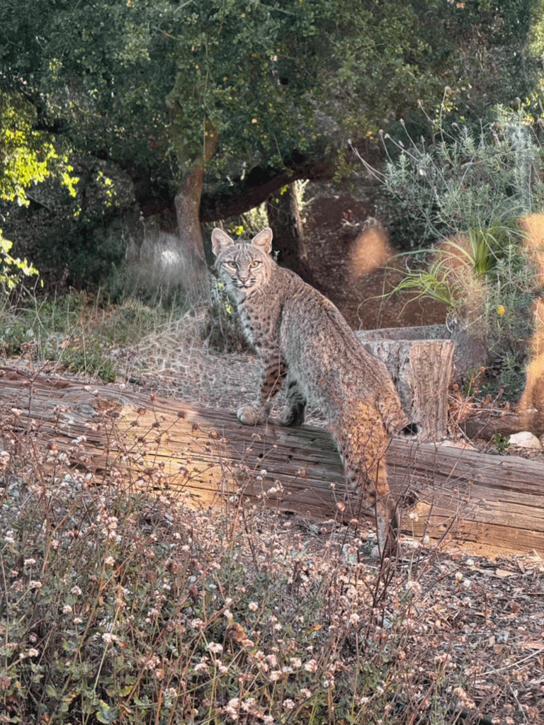On our first morning back in Santa Barbara, a bobcat posed for us right outside our kitchen window. He stared at us for a minute or two, seeming to say, “I’m a big cat, too!”